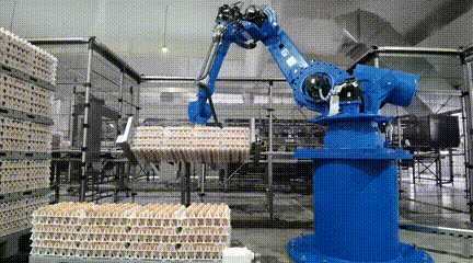 唯有上述各个环节全部通过智能化设备的检测并且合格的鸡蛋,才能最终得以分装。当然,分装的过程依然不需要人工参与,从装入托盘,到放置箱内,到进行封口、整齐码垛,全部由机器人完成。